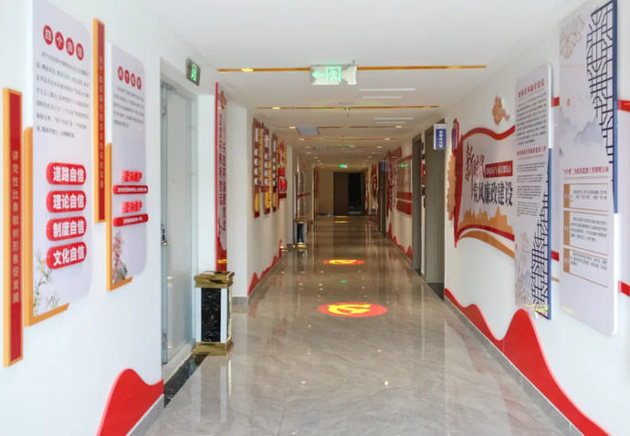 集團黨建活動陣地位于集團辦公樓11樓,占地180㎡,分為黨建文化長廊、黨員活動室、支部會議室三個功能區(qū),集黨員學(xué)習(xí)教育、組織生活開展、黨建成果展示等功能于一體。其中,黨建文化長廊由黨建引領(lǐng)發(fā)展、傳承紅色精神、筑牢戰(zhàn)斗堡壘、挺膺擔(dān)當(dāng)奮進、構(gòu)建精神文明、建設(shè)廉政文化六個部分組成,圖文并茂的形式讓每一位走過長廊的黨員都能深刻領(lǐng)悟黨建工作的深刻內(nèi)涵。黨員活動室包含了組織架構(gòu)展示、榮譽展示、黨建工作展示、學(xué)習(xí)區(qū)等內(nèi)容,配備桌椅茶幾等休閑設(shè)施,布置溫馨,氛圍濃厚。