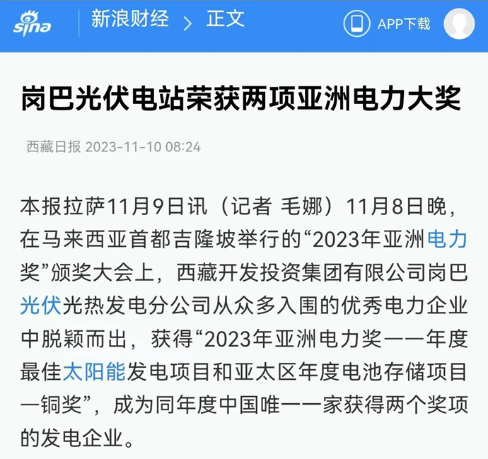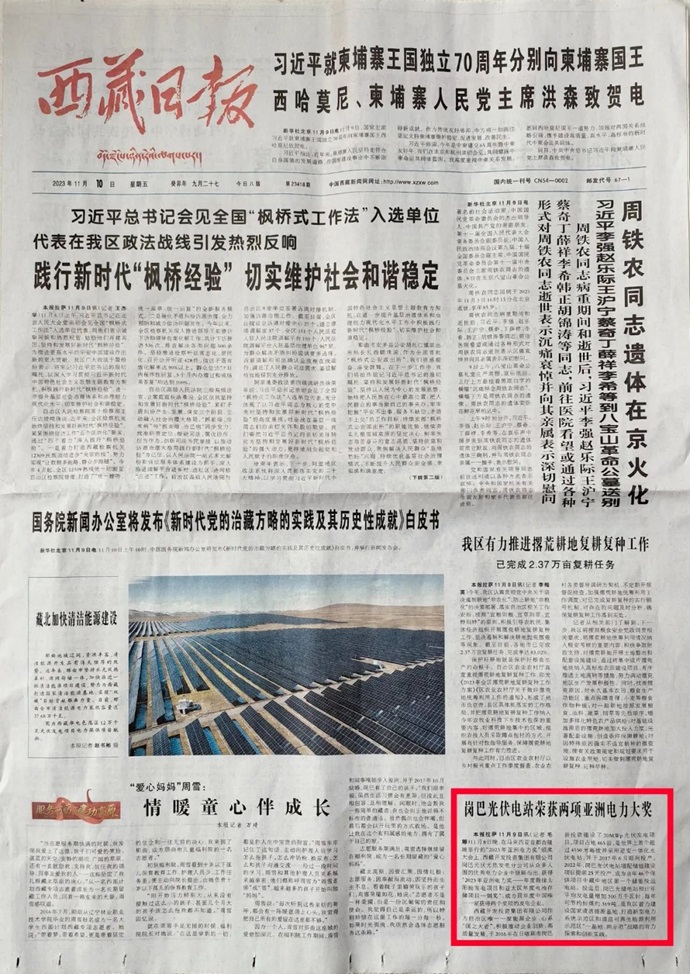 科技日報、西藏日報、西藏日報客戶端等多個媒體報道了《西藏開發(fā)投資集團(tuán)有限公司崗巴光伏電站榮獲2023年度兩項(xiàng)亞洲電力大獎》