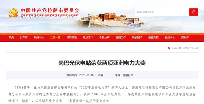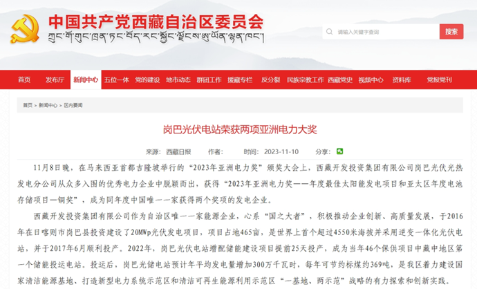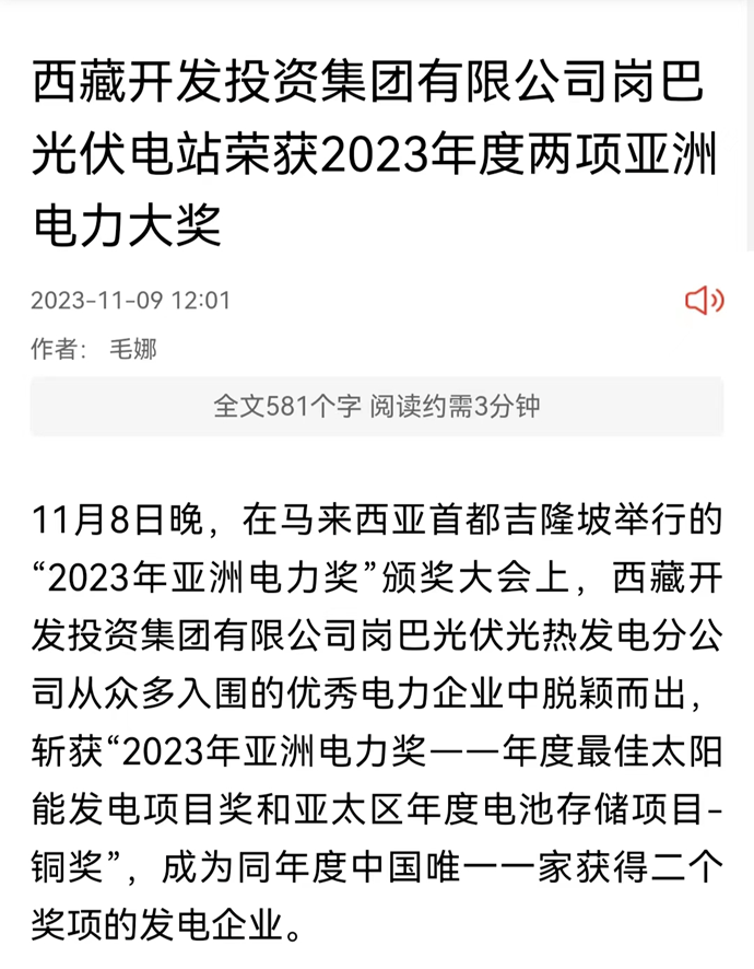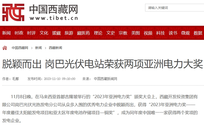 編者按:11月9-10日,科技日報、西藏日報、西藏日報客戶端、新浪財經(jīng)客戶端、中國西藏網(wǎng)、中國共產(chǎn)黨西藏自治區(qū)委員會官網(wǎng)、中國共產(chǎn)黨拉薩市委員會官網(wǎng)等多個媒體報道了《西藏開發(fā)投資集團(tuán)有限公司崗巴光伏電站榮獲2023年度兩項(xiàng)亞洲電力大獎》。全文如下:
