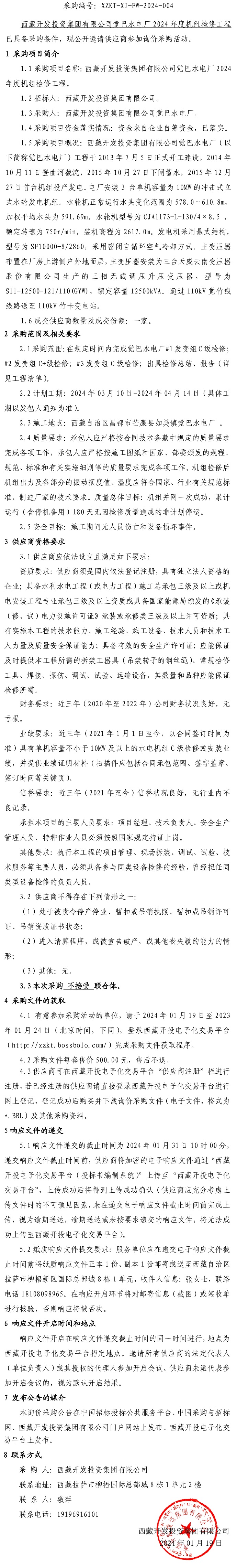 西藏開發(fā)投資集團(tuán)有限公司覺巴水電廠2024年度機組檢修工程詢價采購公告